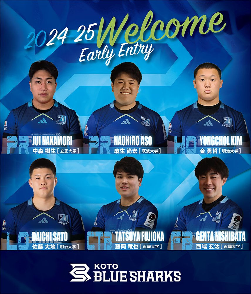 Les deux dernières signatures derrière sont le centre Tatsuya Fujioka (Kindai Univ.) et l'arrière Genta Nishibata (Kindai Univ.). Les six jeunes joueurs pourront faire leurs débuts en League One assez vite grâce au système d'entrée anticipée.