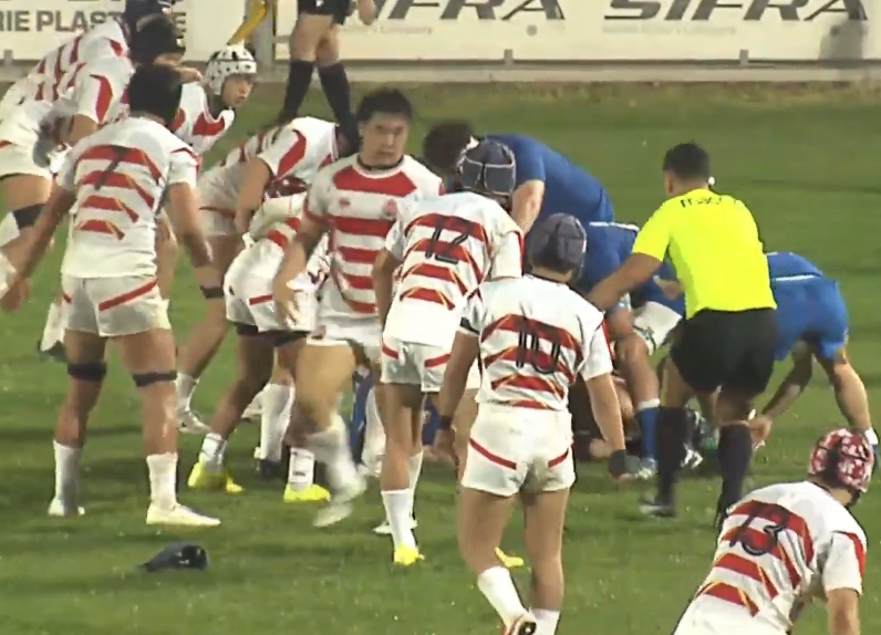 En première mi-temps, les visiteurs dominés en conquête, sur les impacts et dans la zone autour des rucks. Avec une défense porte de saloon, les U19 nippons s'en sortaient miraculeusement avec un score de 3 à 10 à la pause.